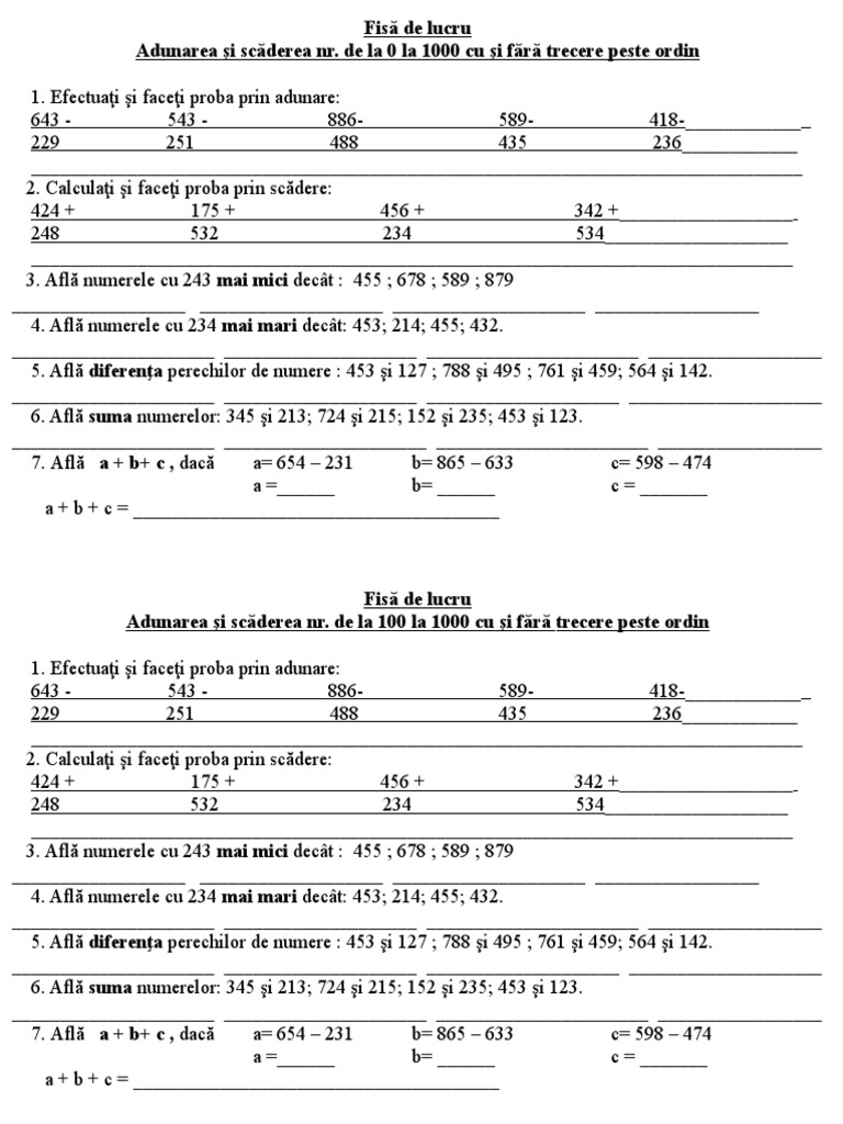 Adunarea Si Scaderea Numerelor 0 1000 Fara Trecere Peste Ordin