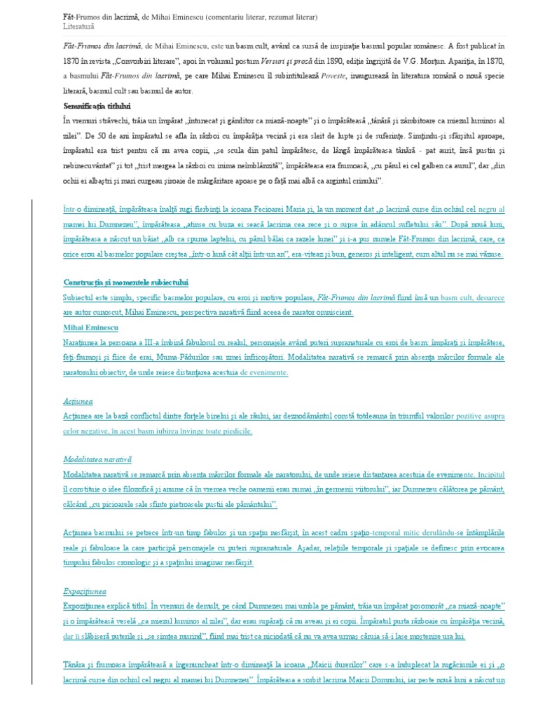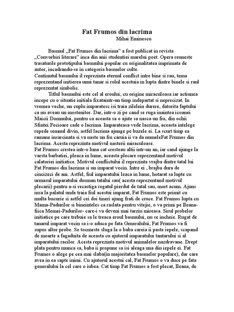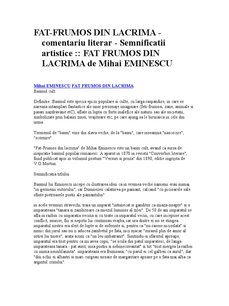 Comentarii Literare Fat Frumos Din Lacrima Mihai Eminescu