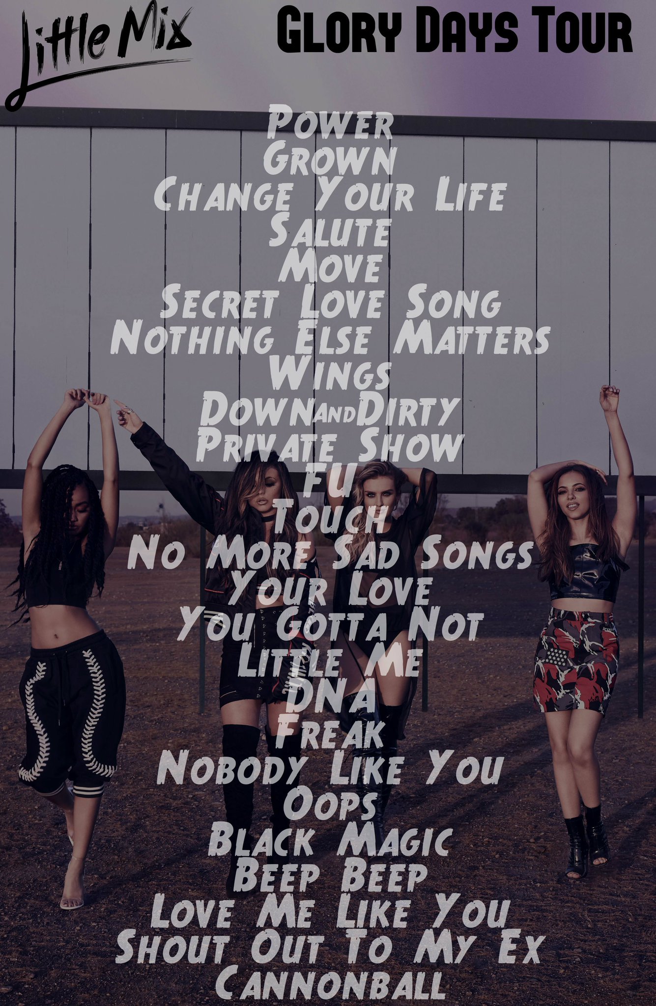 View little mix s concert history along with concert photos videos setlists and more. The tour began on 21 may 2017 in birkenhead england and after stops in europe oceania and the united kingdom it ended on 26 november 2017 in london england. View average setlists openers closers and encores of little mix for the tour the glory days tour. The glory days tour was the fourth concert tour and the second worldwide tour by british girl group little mix in support of their fourth studio album glory days.