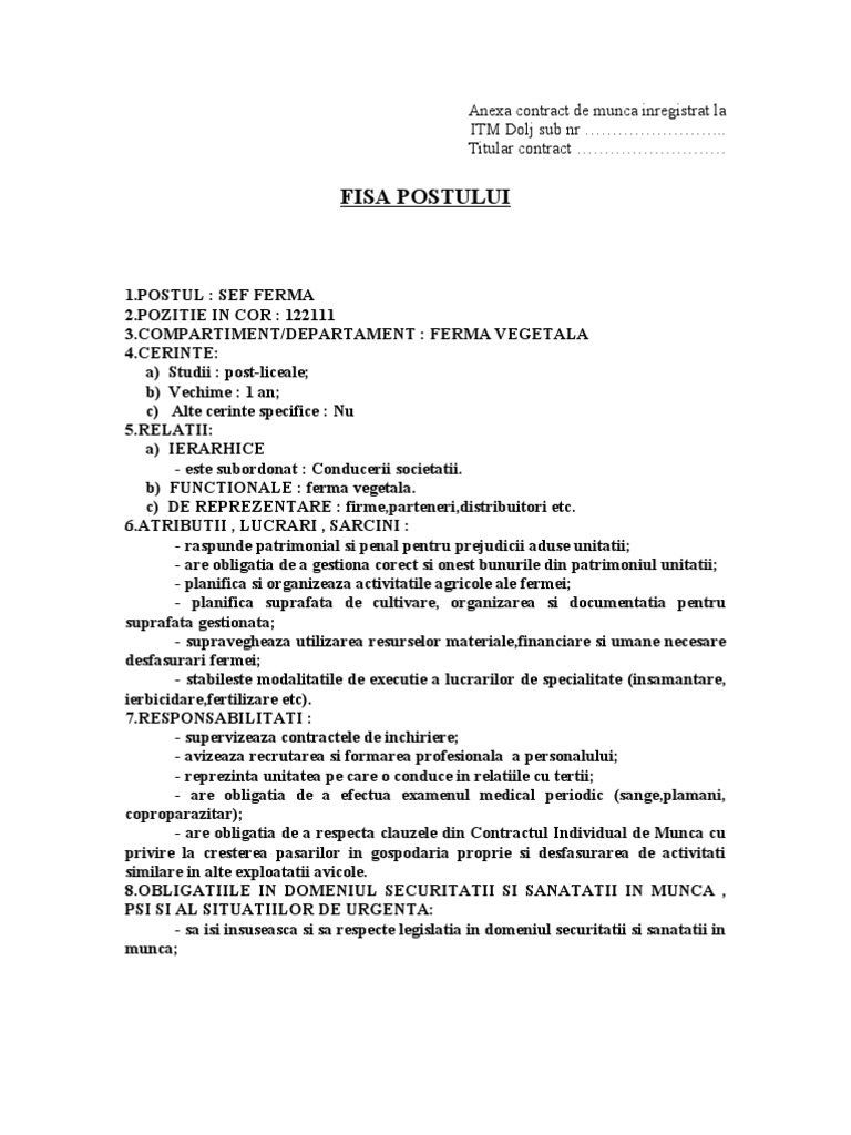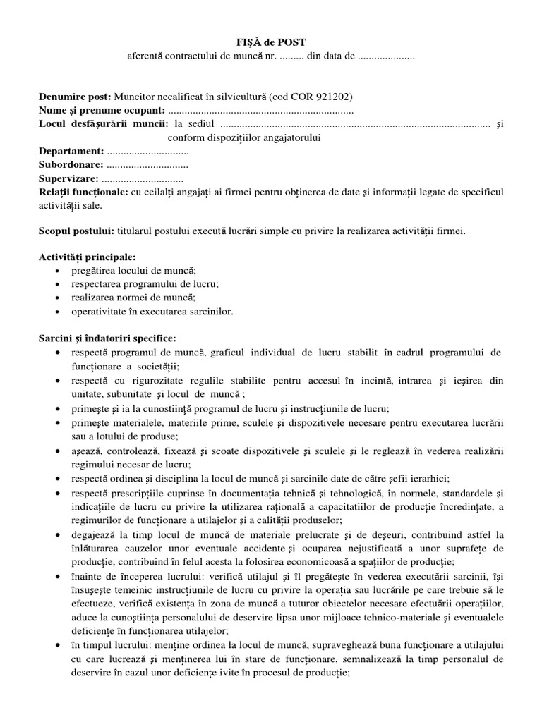 Fișa Postului și Fișă De Evaluare A Performanțelor Individuale Pentru Muncitor Necalificat In Agricultură Cod Cor 921302