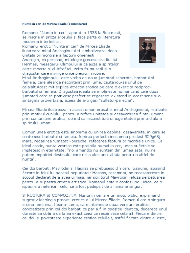 Doc Nunta In Cer Comentariu Literar Romanul Erotic De Mircea Eliade Bianca Sofronie Academia Edu