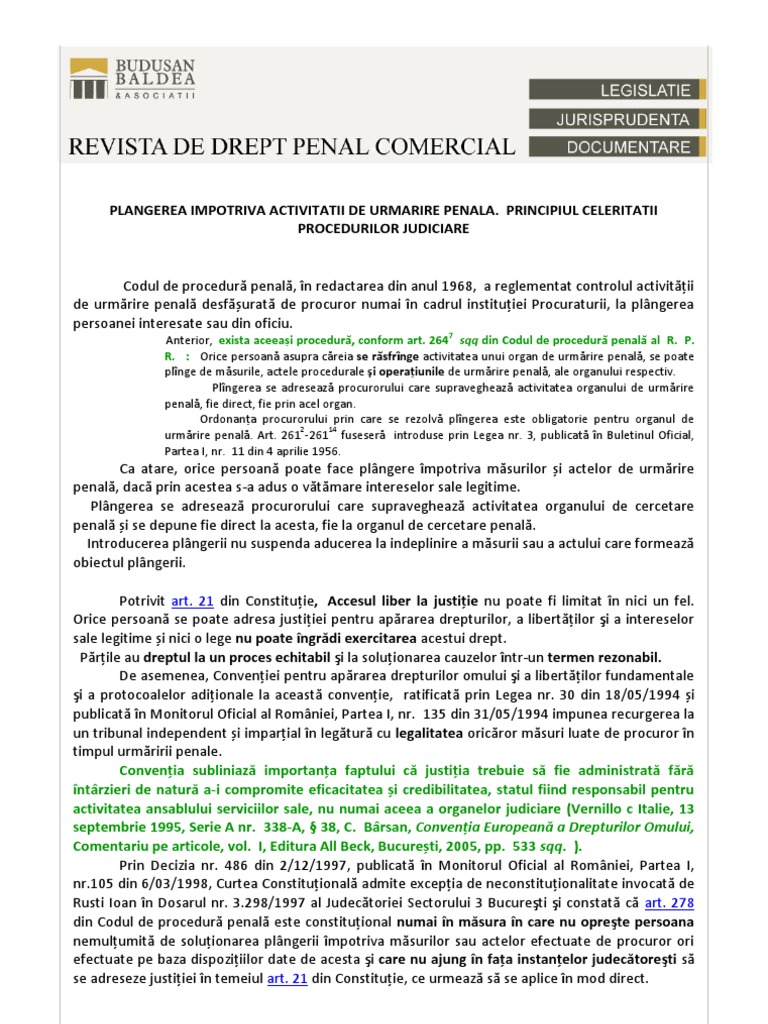 Plangerea Impotriva Activitatii De Urmarire Penala Principiul Celeritatii Procedurilor Judiciare