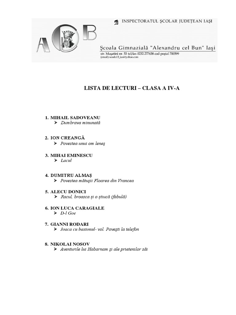 Lista De Lecturi Clasa A Iv A 1 Mihail Sadoveanu