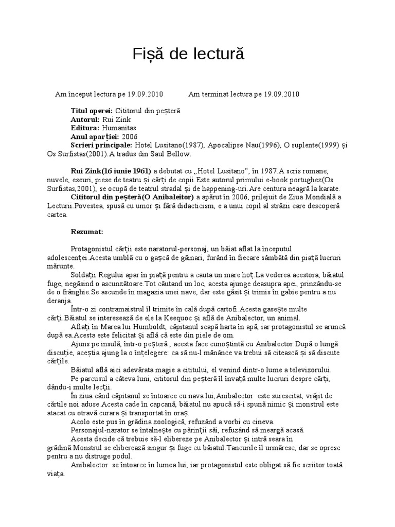 Cititorul Din Peșteră Rezumat După Rui Zink Colectionara De Carti