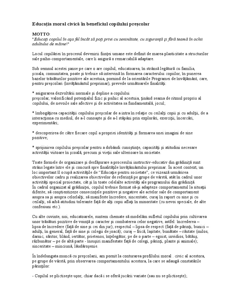 Educaţia Moral Civică In Beneficiul Copilului Prescolar
