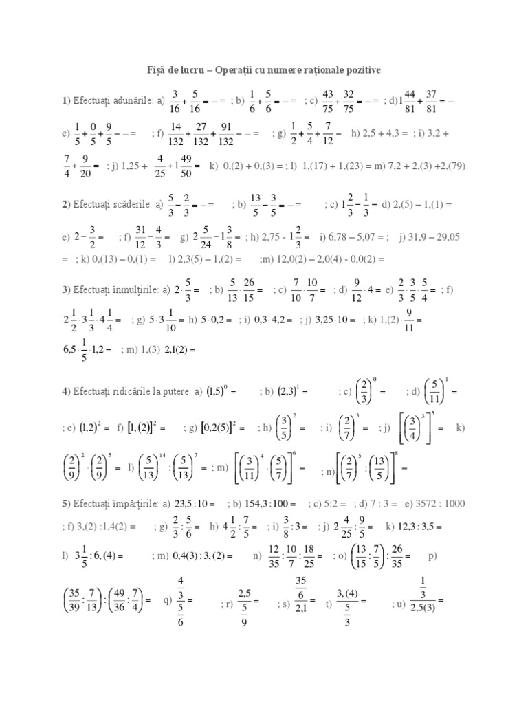 Fisa De Lucru Operatii Cu Numere Rationale Pozitive